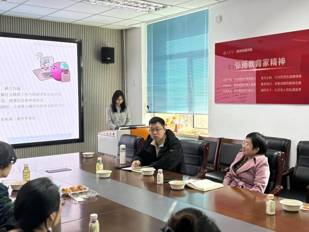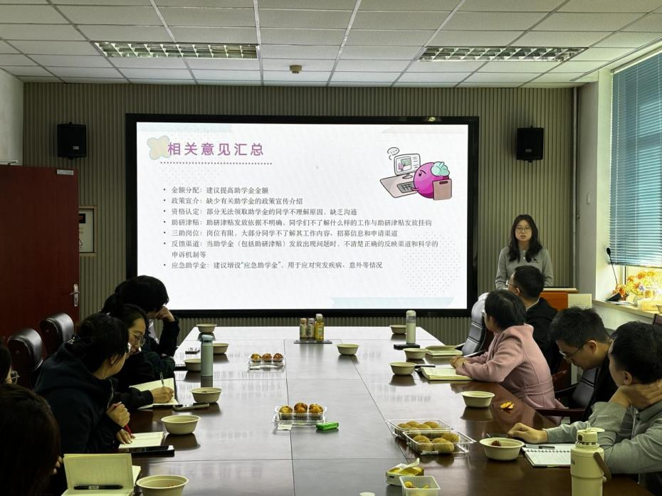 王丽君表示,对于同学们提出的合理建议,学院将予以高度重视并进行充分考量。于智源就“三助一管”岗位设置、审批流程及助研津贴发放标准进行详细介绍,明确助管岗位审批需严格遵循学院规定。同学们在此基础上畅所欲言,结合自身经历和个人意见进行补充。本次意见征集既体现了学院倾听学生诉求、优化奖助体系的务实作风,又彰显了其保障学生权益、切实激发学术与实践活力的坚定决心。