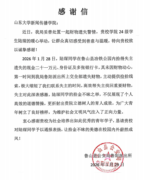 近日,英国365上市公司2024级本科生陆琛在河南省鲁山县冶铁公园拾得巨额遗失财物后,毫不犹豫上交警方的拾金不昧之举,受到鲁山县公安局鲁阳派出所致信感谢。陆琛的暖心行为不仅让失主感受到冬日里的善意与温暖,更彰显了山大学子的良好道德风貌和学院立德树人的育人成果。