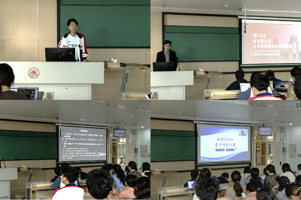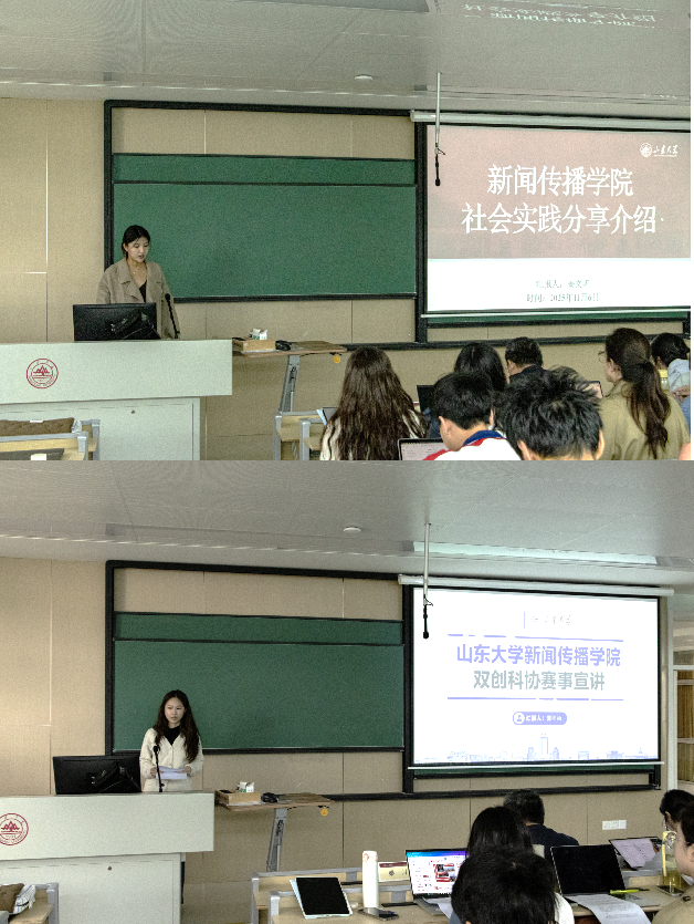 会议伊始,学院团委实践部与创新与创业中心分别开展工作梳理与赛事解读。实践部代表姜文昕同学系统回顾学院近年社会实践活动的组织脉络、丰硕成果与关键节点,为同学们清晰呈现实践工作的整体图景;创新与创业中心代表刘梓涵同学则聚焦“互联网+”“挑战杯”“三创赛”等核心赛事,详细拆解赛事特点与时间周期,帮助同学们构建对创新创业竞赛的宏观认知。