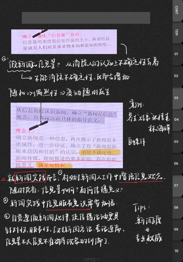 陈诗棋的笔记以唯物新闻观为主线,系统梳理了新闻起源论、传播类型及新闻本体论等核心知识,构建了完整的课程框架。对于课件中难以及时记录的部分,采用“拍照+插入图片”的方式的方式进行处理,使得笔记既能实时跟进课堂节奏,又避免了因匆忙抄录而可能产生的信息遗漏或失真。