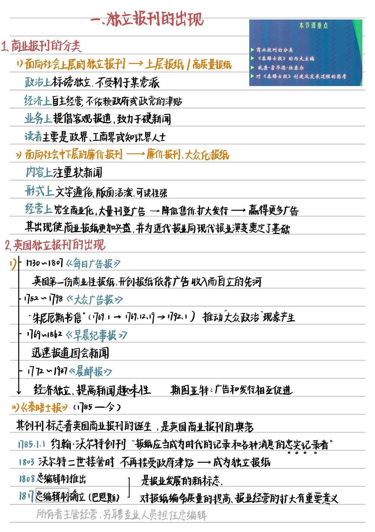 赵若苓的笔记通过不同颜色的字体强调突出重难点,在文字周围适当留白,排版视觉效果美观。笔记以独立报刊的出现和近代新闻事业的诞生为主要内容,以“总—分”结构展开,在笔记开头标注课堂重点,方便于后期复习和记忆。