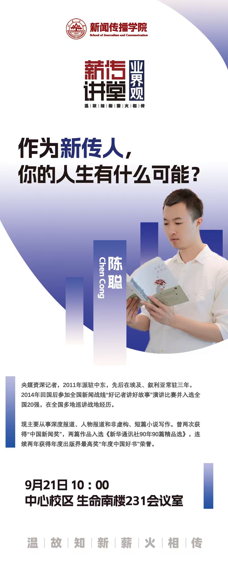 陈聪,央媒资深记者,2011年派驻中东,先后在埃及、叙利亚常驻三年,2014年回国后参加全国新闻战线“好记者讲好故事”演讲比赛并入选全国20强,在全国多地巡讲战地经历。现主要从事深度报道、人物报道和非虚构、短篇小说写作。曾两次获得“中国新闻奖”,两篇作品入选《新华通讯社90年90篇精品选》,连续两年获得年度出版界最高奖“年度中国好书”荣誉。