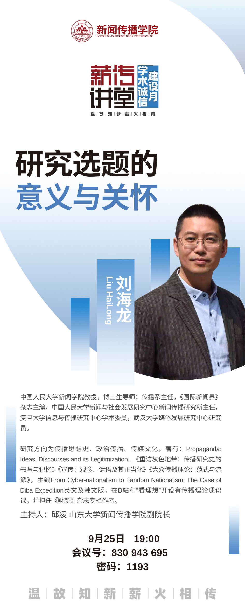 刘海龙,中国人民大学新闻学院教授,博士生导师;传播系主任,《国际新闻界》杂志主编,中国人民大学新闻与社会发展研究中心新闻传播研究所主任,复旦大学信息与传播研究中心学术委员,武汉大学媒体发展研究中心研究员。研究方向为传播思想史、政治传播、传媒文化。著有:Propaganda: Ideas, Discourses and its Legitimization. ,《重访灰色地带:传播研究史的书写与记忆》《宣传:观念、话语及其正当化》《大众传播理论:范式与流派》,主编From Cyber-nationalism to Fandom Nationalism: The Case of Diba Expedition英文及韩文版,在B站和“看理想”开设有传播理论通识课,并担任《财新》杂志专栏作者。