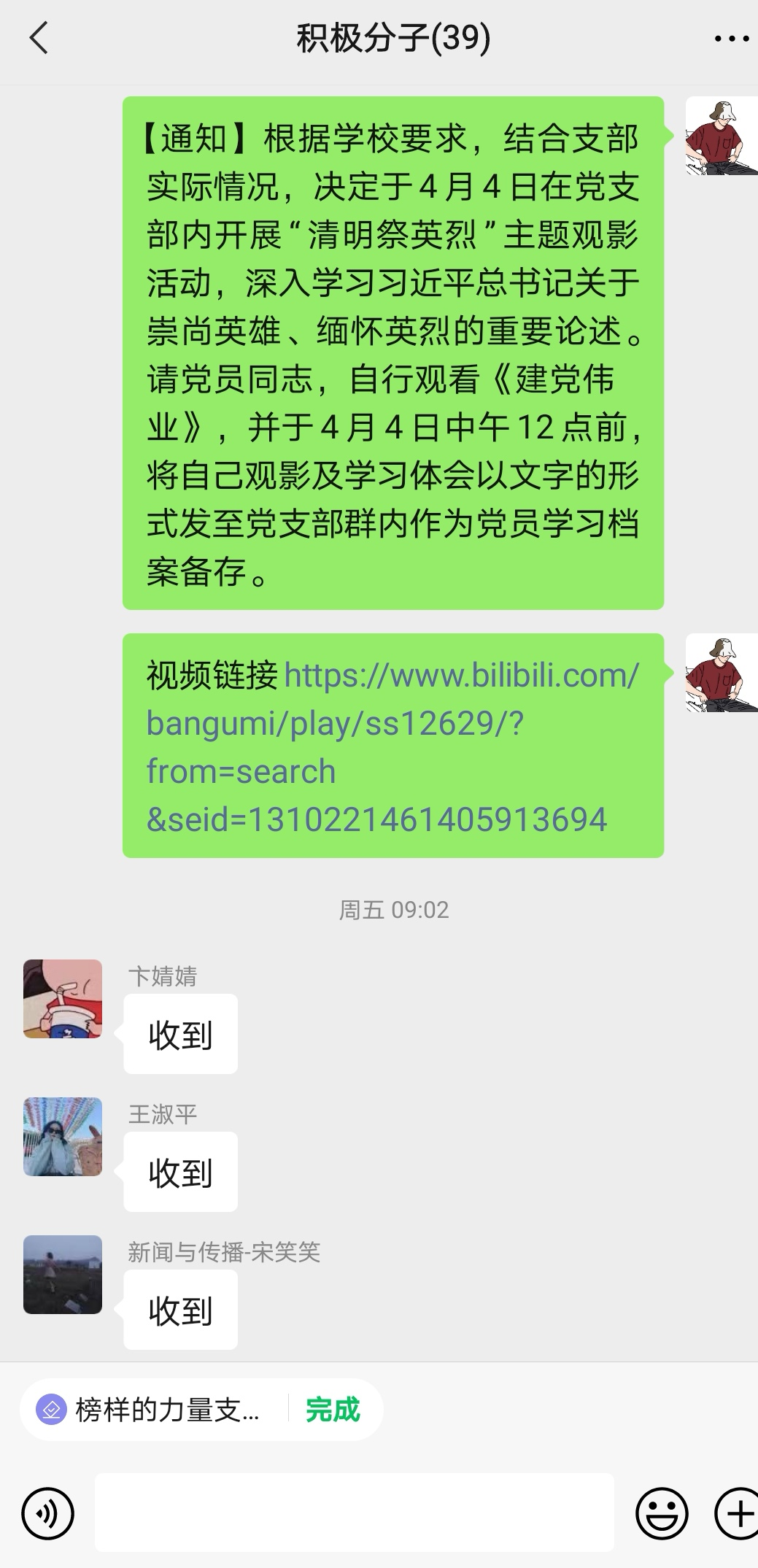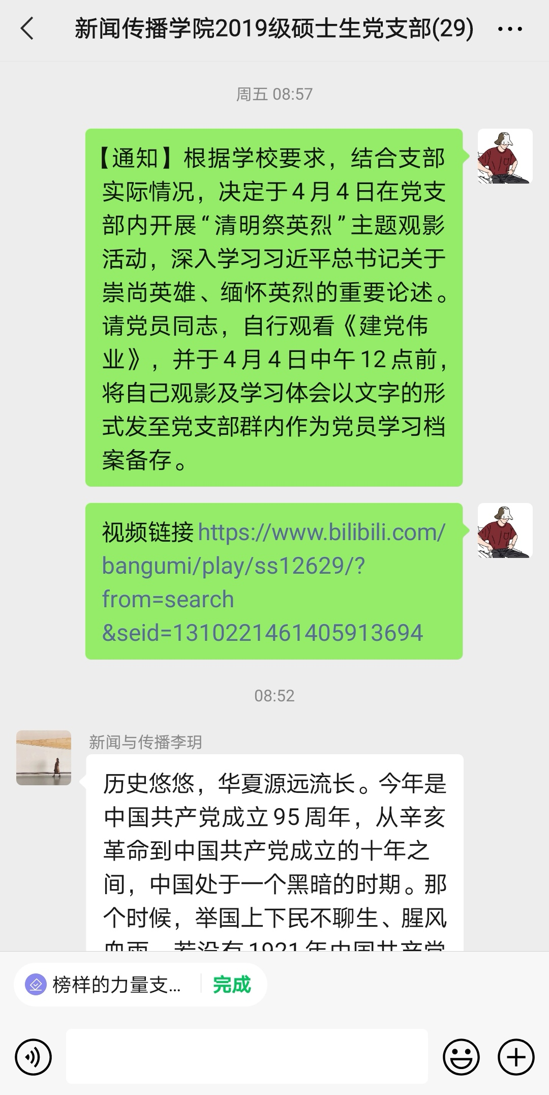 本次观影主题活动,以“观影+分享”的形式开展,党支部全体成员自行观看影片《建党伟业》,并于清明节当天在微信群进行观影感悟分享。《建党伟业》围绕1921年前后展开,展现了1911年辛亥革命后到1921年中国共产党成立这段时光内的历史故事与风云人物,它以毛泽东、李大钊、陈独秀、蔡和森、周恩来等一批中国共产党员为中心,讲述了他们在风雨摇摆的时代为国家赴汤蹈火的精彩故事。这是一个青春、激情、奋斗、献身的故事。在那一代年轻人的身上,担负着救亡图存、改写历史的大任。正是这批年轻人,用他们的青春与热血,描绘出了新生的中国,谱写了一曲瑰伟壮丽的礼貌之歌。我们今天的一切,都与他们当年的奋斗和发奋息息相关,他们与我们,昨日和今天,血肉相连。作为新一代的年轻人,作为学生党员,我们更有义务与职责,将共产主义事业进行下去,为祖国的明天而奋斗。
