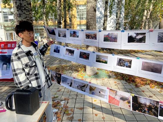 在活动中,2021级硕士生党支部成员们分为三小组参与活动,一组负责火灾案例照片墙的讲解,这一区域呈现出了近几年来我校以及我国其他高校曾发生的典型火灾案例,通过极具视觉冲击力的图片来予以警示。二组成员参与了协调现场答题活动,引导同学们扫码参与消防安全知识有奖答题。三组同学在活动现场周边负责宣传单页的发放,并为大家科普校园安全知识。