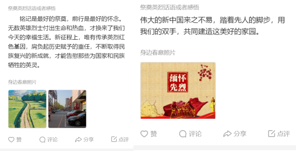 在线下,支部倡议党员和入党积极分子发挥新闻传播专业技能,随手拍身边春意,在网络云端上传春意照片并表达对英烈的哀思,缅怀英雄先烈,致敬英烈精神。2019级硕士生王淑平拍摄了校园中的满树桃花,并表示“今日百花盛开的太平盛世因你们的鲜血和牺牲才得以实现。山河锦绣,思念永存”。2020级硕士生李雅琳用盛放的梨花寄托哀思,表示“春天很好,只是很想您。不负春光,不负英烈遗志,我们将继续前行”。2020级硕士生任欢发表感言:“清明时节缅怀先烈,铭记历史,捍卫来之不易的和平美好生活,吾辈当自强,砥砺前行!”